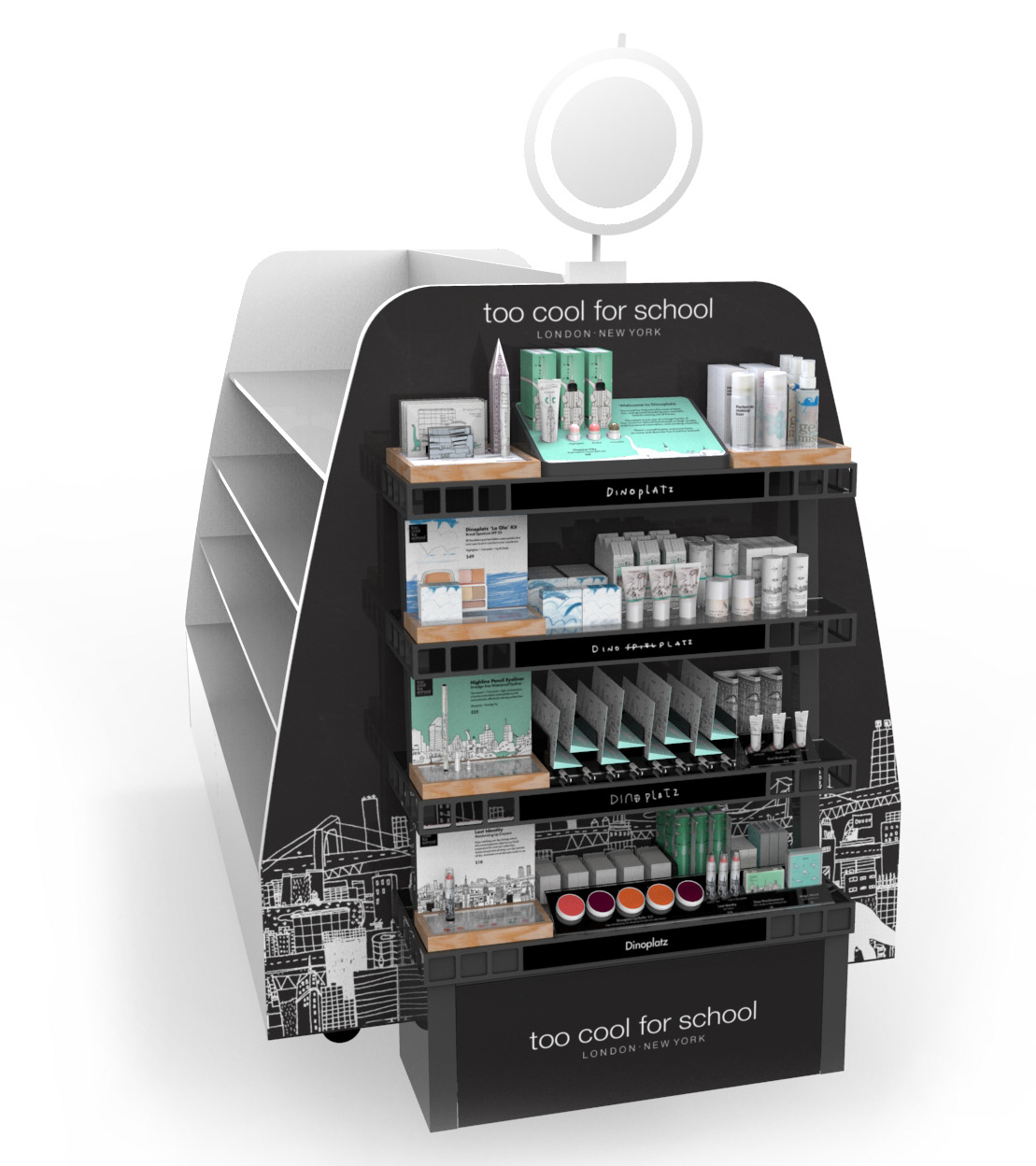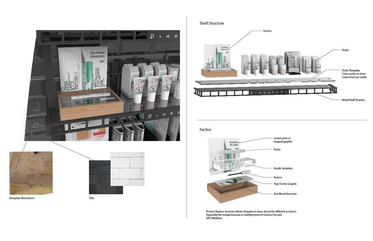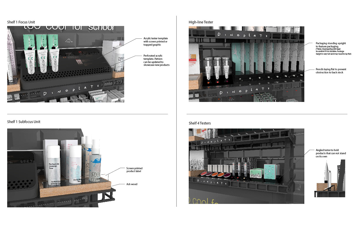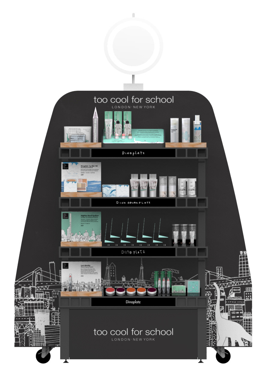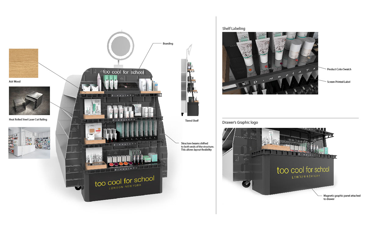 Sephora was launching a new brand called "Too Cool for School" that required conceptual designs for an endcap. Leading the design project for the brand culminated in the final renderings below of the fixtures, with a market launch in Fall 2015.